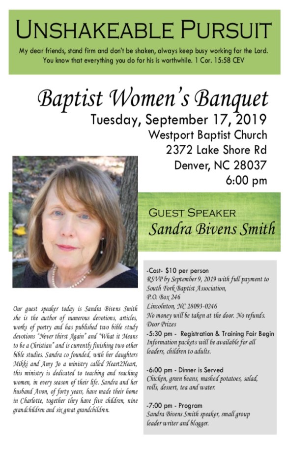 I am honored and humbled to be invited to speak at upcoming Baptist Women’s Banquet. These women do some amazing mission work! If you are in the Charlotte area, please come out and support their ministry.