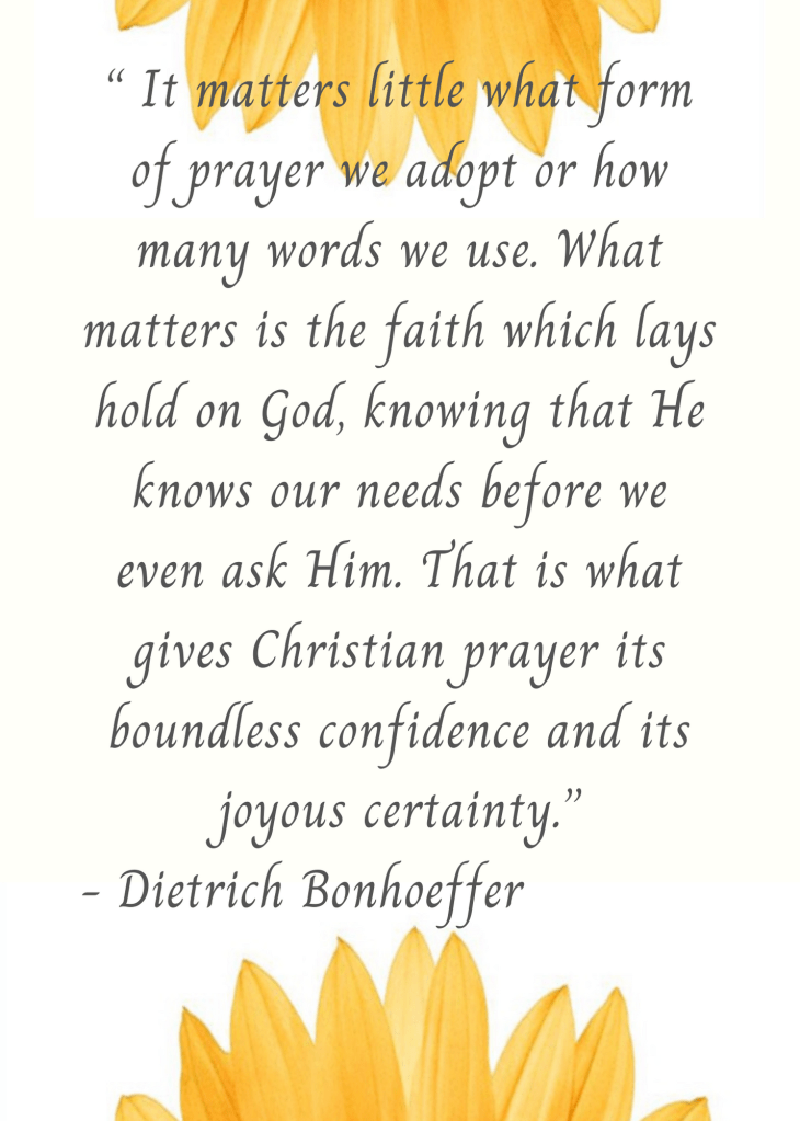 Moment of Joy Posted on March 14, 2021 by Sandra Bivens Smith Therefore I say to you, all things for which you pray and ask, believe that you have received them, and they will be granted you. (Mark 11:24) Click to share on Facebook (Opens in new window) Facebook Click to email a link to a friend (Opens in new window) Email Click to print (Opens in new window) Print Click to share on LinkedIn (Opens in new window) LinkedIn Click to share on X (Opens in new window) X Like Loading...