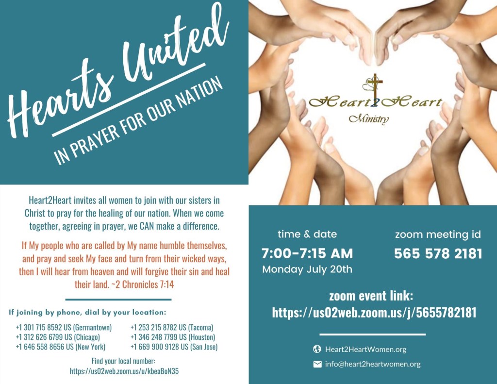 Women, our nation is hurting; she needs our prayers. Heart2Heart is calling all sisters in Christ to gather on Zoom Monday morning, July 20 @7:00 for prayer. This is an opportunity for Christian women from across our country to come together with one mind and one heart, to humble ourselves before God asking Him to heal our land.